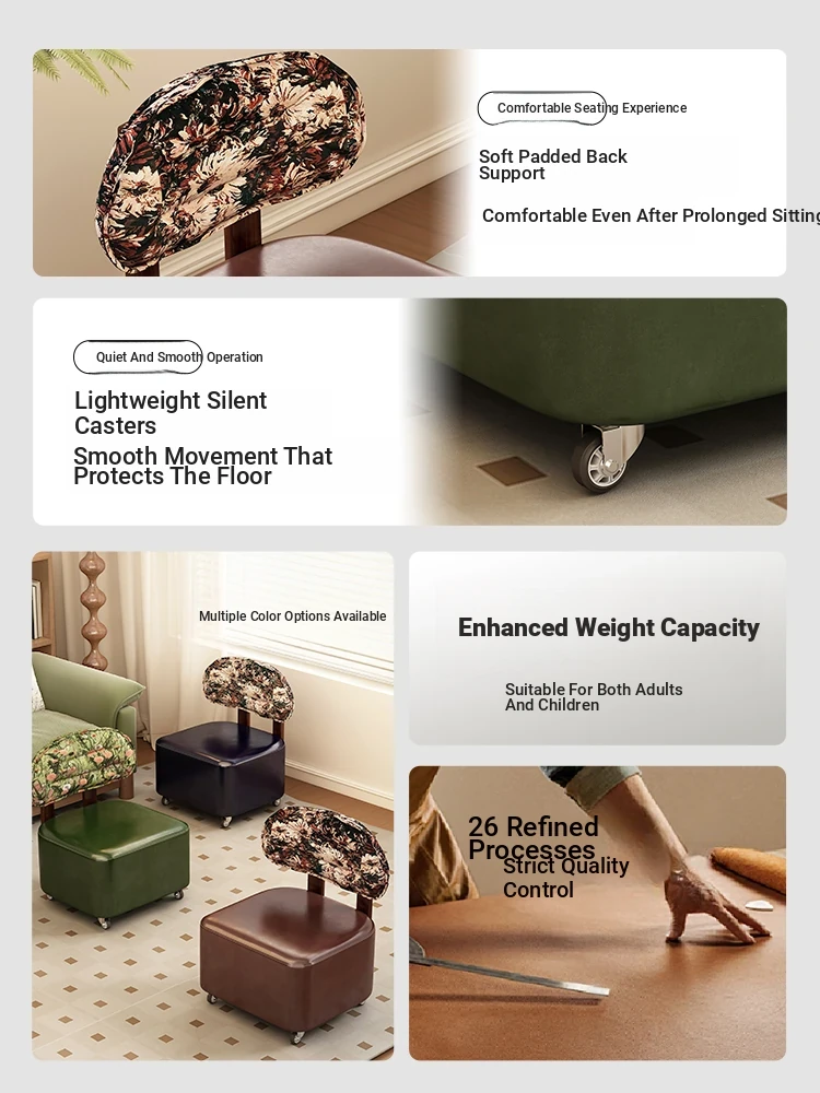 Durable Solid Wood Stool with Wheels and Backrest – Perfect for Home Use, Living Room, Shoe Changing, and Sofa Seating – Compact and Sturdy Design for Versatile Functionality