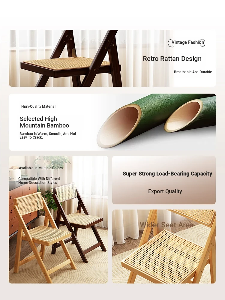Foldable Rattan Chair with Backrest - Vintage Style Dining Chair for Tea Table - Scandinavian Natural Wood Dining Chair - Bamboo Chair for Cozy Dining Spaces