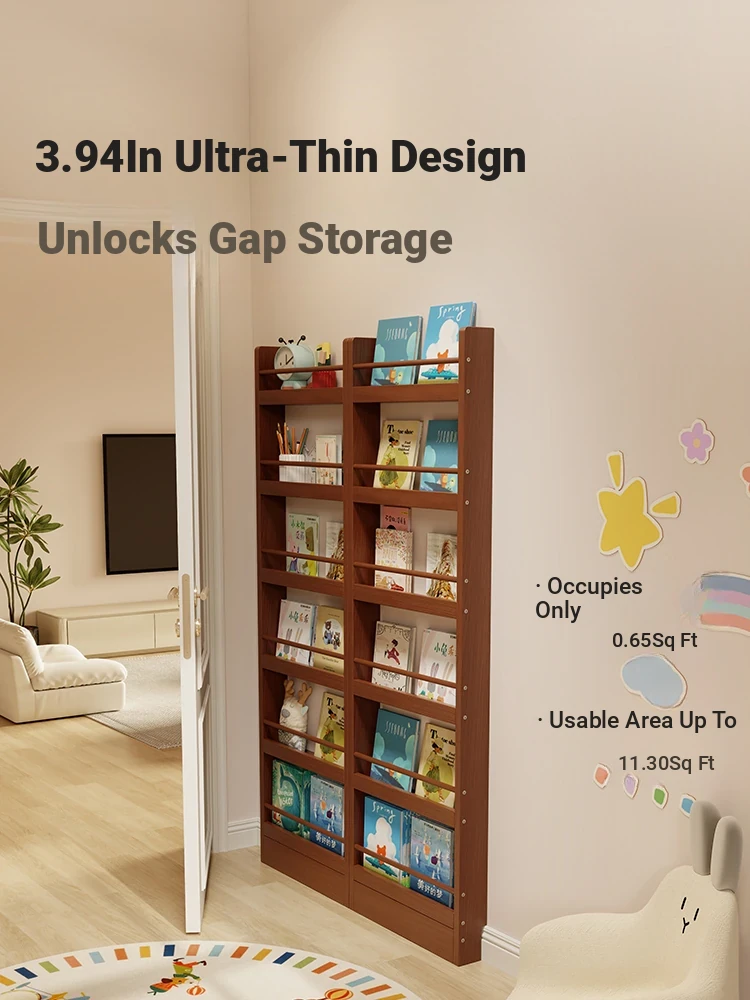 Slim Wall-Mounted Bookshelf for Kids - Space-Saving Floor Storage Rack, Perfect for Picture Books and Ideal for Narrow Spaces Behind Doors and Against Walls.