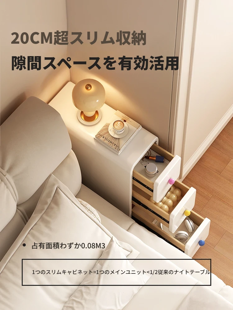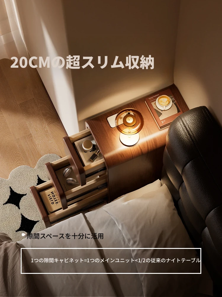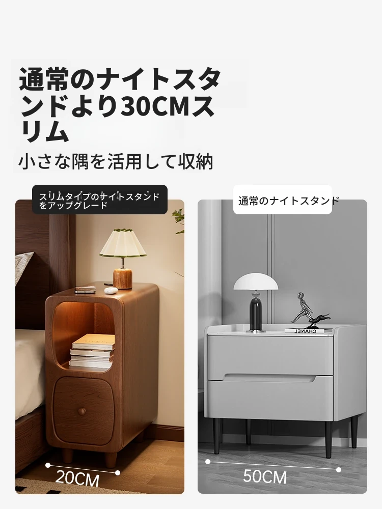 超スリムな無垢材ベッドサイドキャビネット - 省スペースでおしゃれなミニ収納、幅20-30cmのコンパクトデザイン!寝室をスタイリッシュに演出し、必要なものをすっきり収納できます。