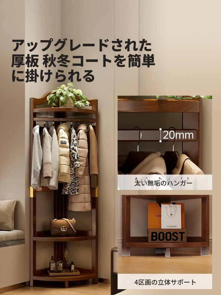 角にピッタリフィット!省スペースでおしゃれな立式コートハンガー。家の寝室やリビングに最適な衣類収納ラック。コートや帽子をスマートに整理整頓!