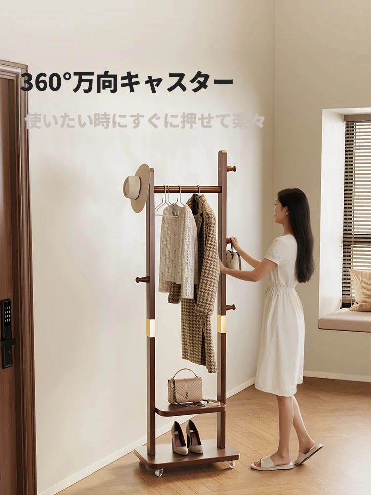 実木製のベッドルーム用コートハンガー、玄関や入り口に最適!移動可能なキャスター付き、家庭用のコンパクトでスリムなデザイン、子供部屋にもぴったりなハンガーラックです。収納力抜群で、おしゃれなインテリアにもなります!