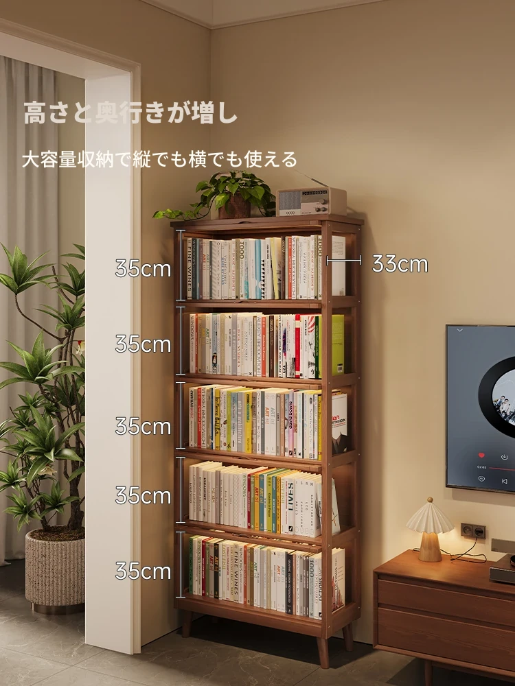 省スペース!シンプルでスタイリッシュな小型多段立式本棚。木製のフロア置き収納ラックとして、壁にぴったりフィット。収納力抜群で、限られた空間でもスッキリ整理!