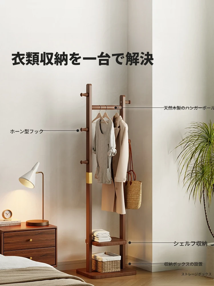 スペースを取らない!実木製のスタイリッシュなハンガーラック。寝室や玄関に最適なコンパクトデザインで、ベッドサイドや入口にぴったり。衣類をすっきり整理できる便利なアイテムです!