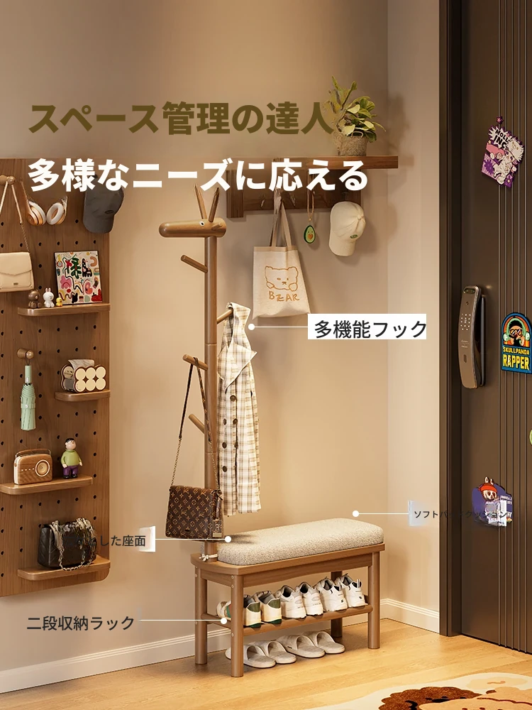 スタイリッシュな無垢材製のコートハンガー - 家庭用・寝室に最適!移動可能なキャビネットで玄関やリビングにもぴったり。衣服やバッグを美しく収納できるアイテムです。
