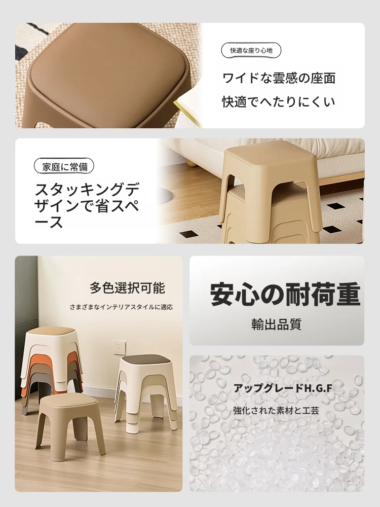 家庭用プラスチック製の厚手スツール、リビングルームやバスルームで大活躍!重ねて収納できるコンパクト設計、子供用にも最適な便利な座椅子。靴を脱ぐときにもぴったり!