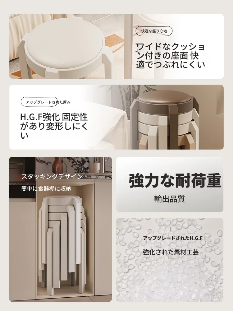 スタイリッシュで高級感あふれる厚手のプラスチック製スタッキングスツール - 家庭用、軽量、サブ用にも最適なラウンドスツール!おしゃれなリビングにぴったりです。