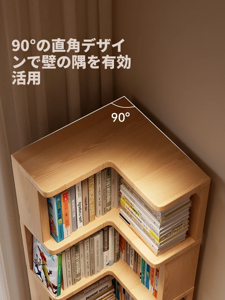 壁に寄り添うコーナー収納キャビネット - 子供向け絵本にもぴったりなスタイリッシュなフロアシェルフ。狭いスペースでも活躍するシンプルな無垢材の本棚で、リビングをおしゃれに演出!