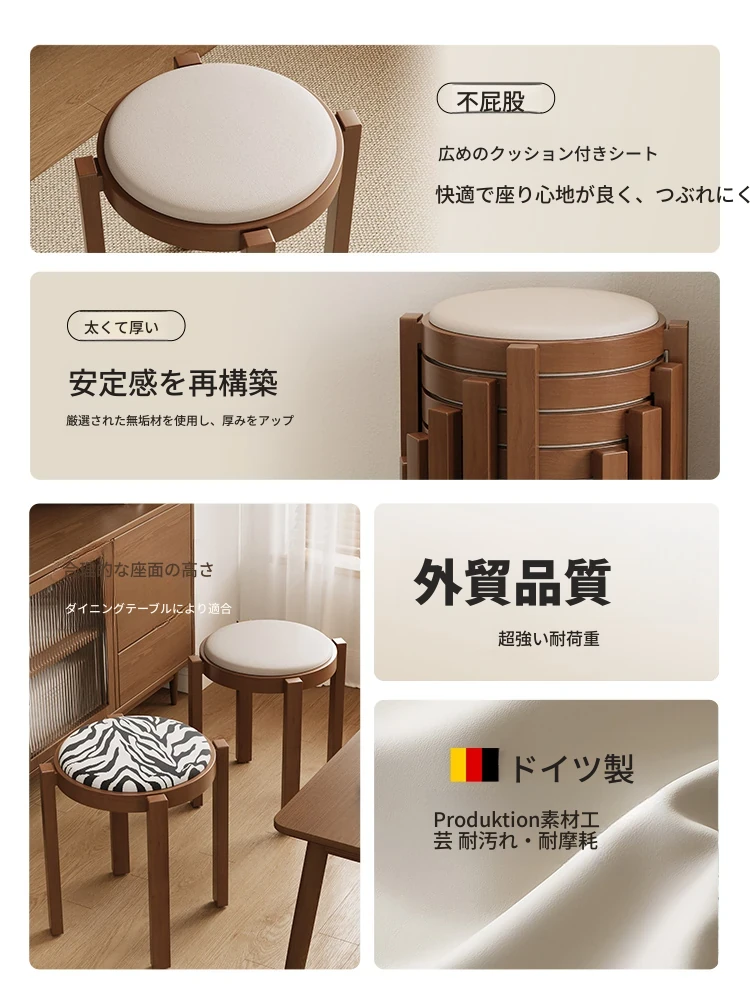 スタッキング可能な天然木製ソフトパッド円形スツール - リビングルームに最適な頑丈な椅子。来客用や家庭用としても活躍!長時間座っても疲れにくい、便利なダイニングスツールです。