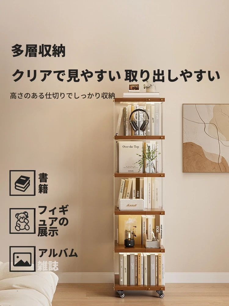 360度回転可能なアクリル書棚 - リビングのテレビ横に最適!多層収納、移動も簡単な天然木製ブックシェルフで、おしゃれで機能的な空間を演出します。