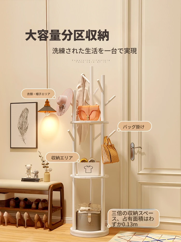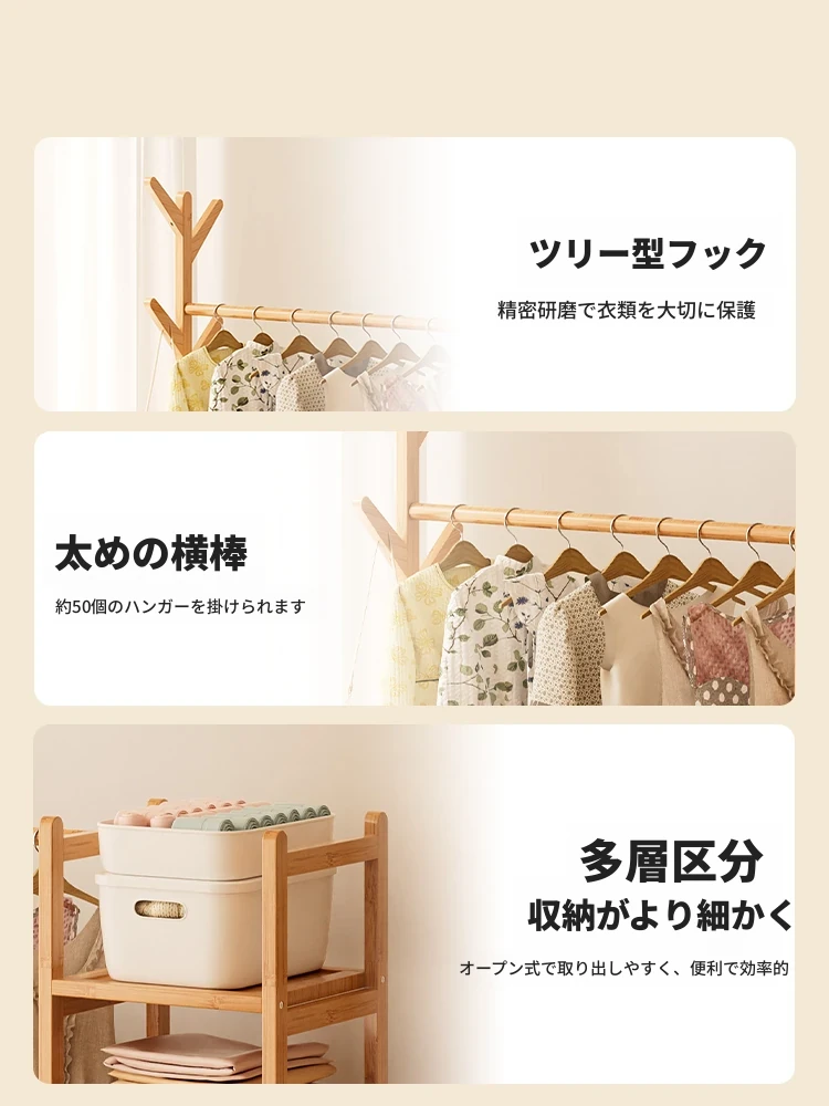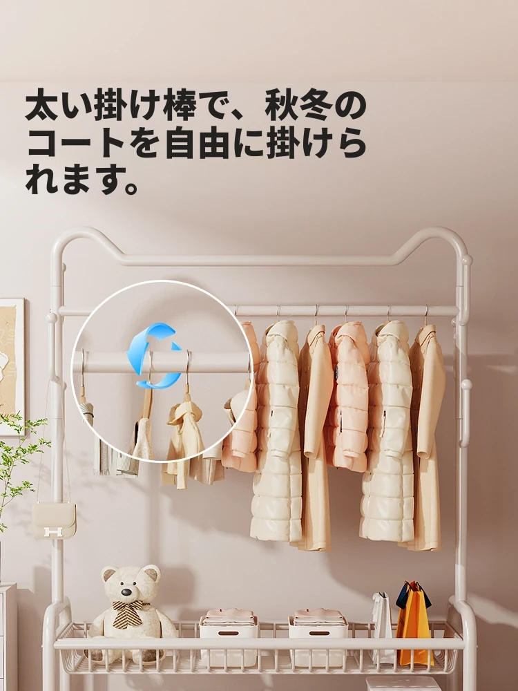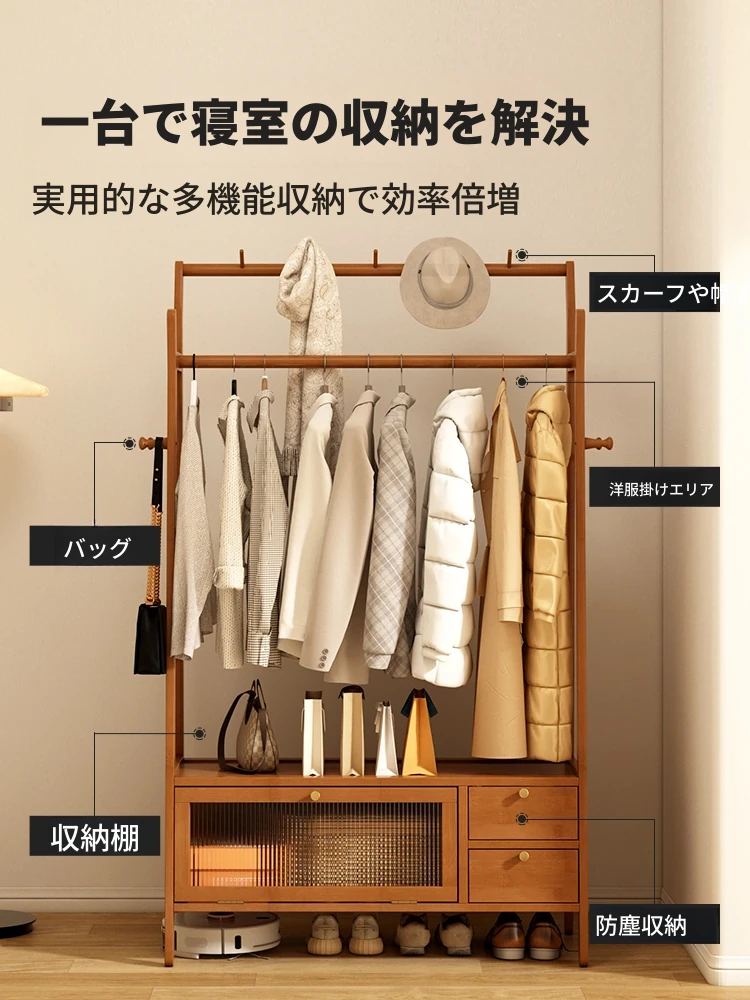 おしゃれな衣類収納!寝室用スタンドハンガー・玄関用物置ラック・部屋用コートラック一体型。防塵仕様のオープン収納クローゼットで、すっきり整理された空間を実現!