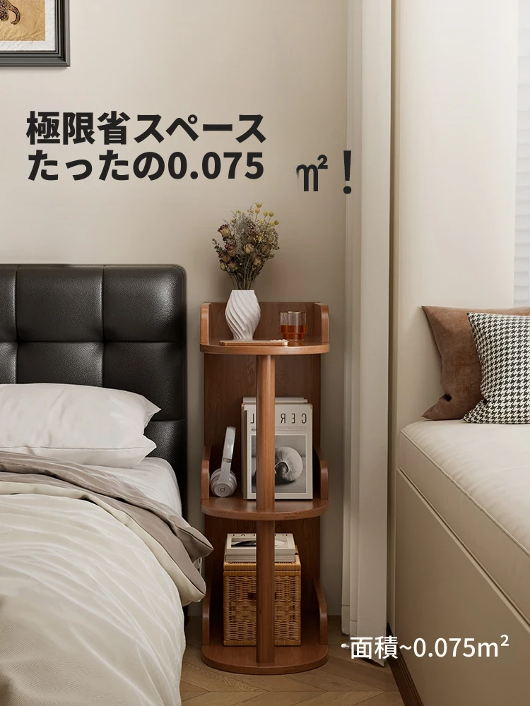 スタイリッシュな無垢材ウォールサイドシェルフ - リビングやソファの横にぴったり!お菓子や本を収納できるコンパクトで便利な多段ラック。狭いスペースにもフィットして、インテリアをおしゃれに演出します!