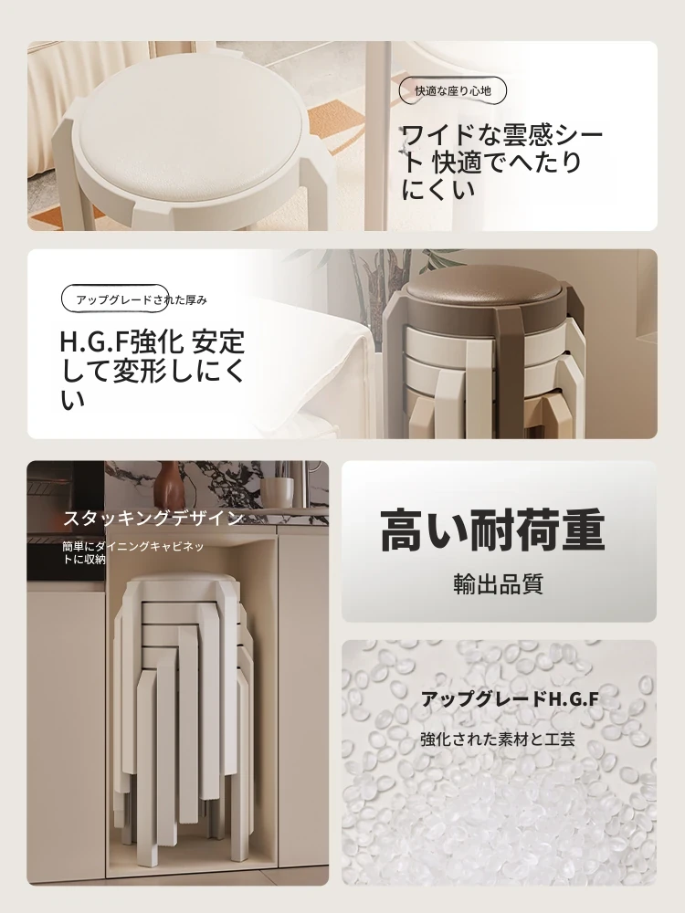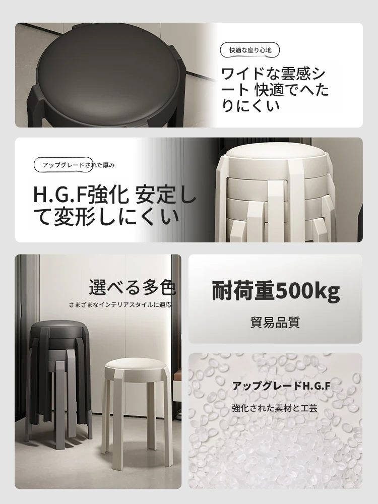 スタイリッシュな重厚感のある積み重ね可能な椅子 - シンプルでモダンなデザイン、家庭用に最適!柔らかなクッション付きの円形スツール、厚手のプラスチック製で耐久性抜群。リビングやダイニングにぴったりの高級感あふれるアイテムです。